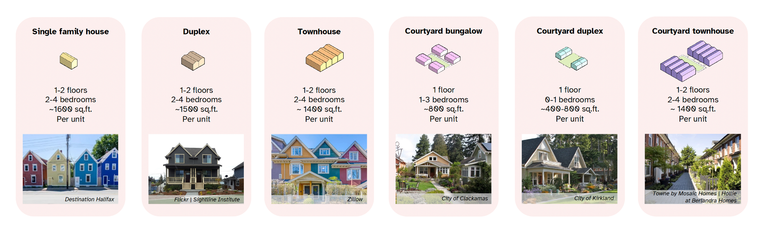 The six defined housing typologies for Pine Tree Park. The proposed housing types respond to local context, market demand, and opportunities to provide diverse housing that supports wellbeing. (Happy Cities)